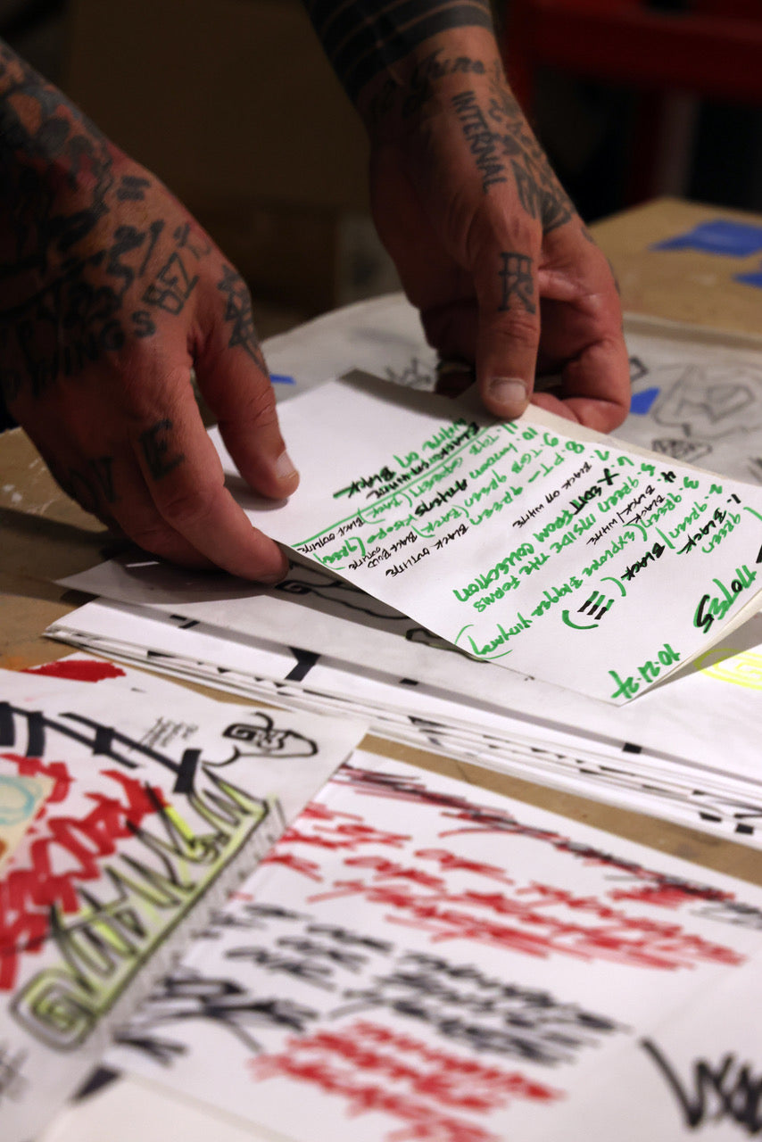 Over the past three decades, JK5 has exhibited globally and collaborated with some of the world’s most influential brands, including Nike, Stüssy, Dover Street Market and Comme des Garçons. Beyond fashion, his artistry spans painting, tattooing, illustration and product design, always rooted in his love of language and the written word.